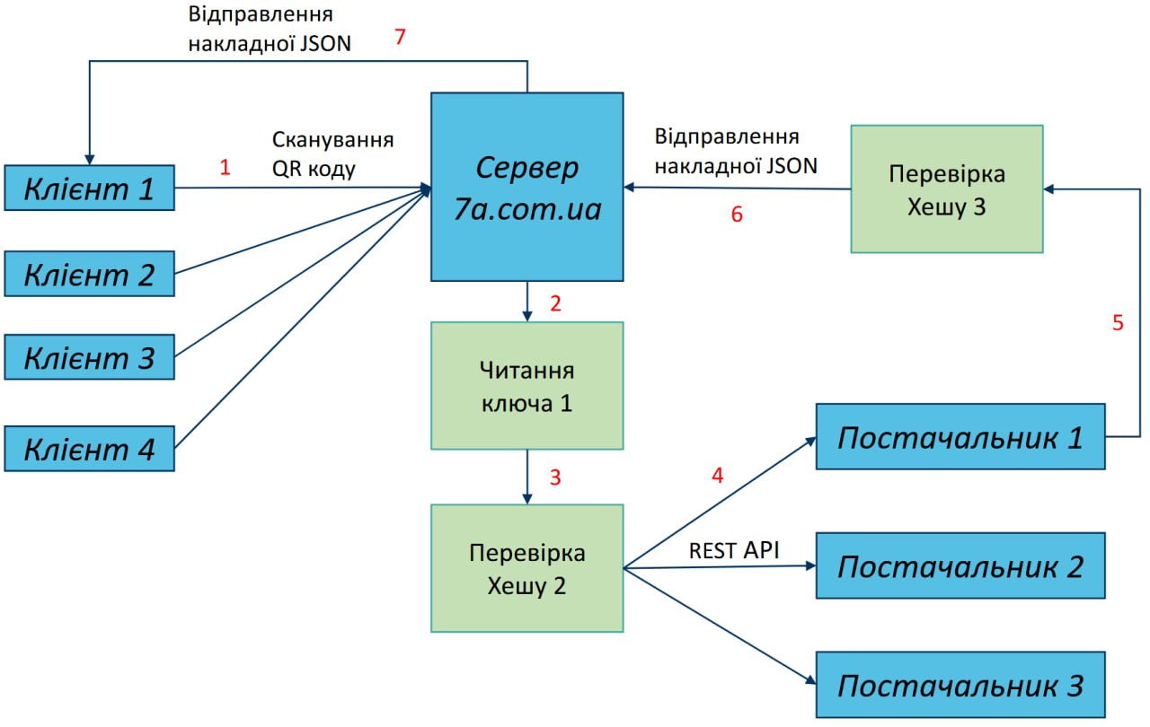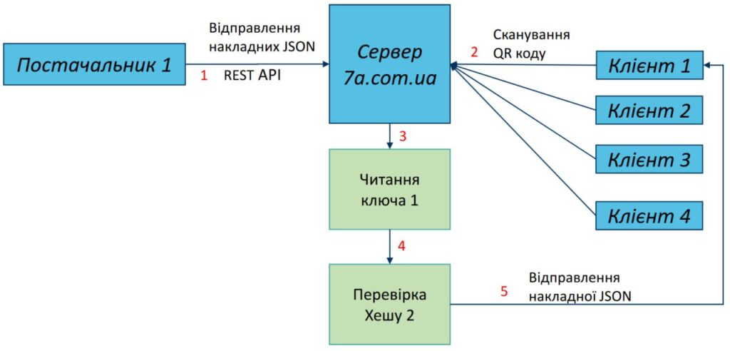 Коли покупець сканує QR‑код, його облікова програма надсилає запит на наш сервер. Ми перевіряємо дані на відповідність і перенаправляємо запит до вашого сервера. Після ваших перевірок ви надсилаєте нам результат — цифрову накладну, яку ми миттєво передаємо покупцю.