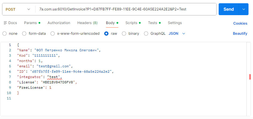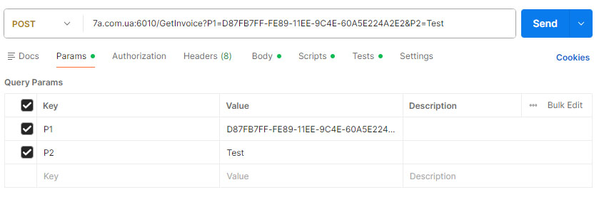 GET http://7a.com.ua:6010/GetInvoice?P=D87FB7FF-FE89-11EE-9C4E60A5E224A2E2&P2=Test